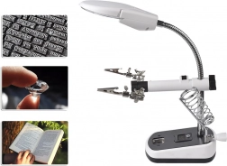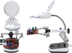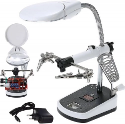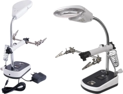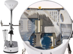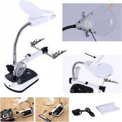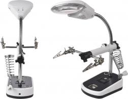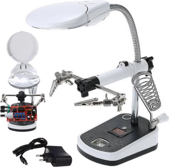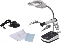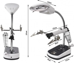 Tato lupa je vybavena silnými krokosvorkami, které lze nastavit v různých úhlech pro pohodlnou práci. Základna obsahuje držák na pájecí baňku, což dále zvyšuje její praktičnost.