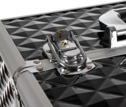 Kombinace černého a stříbrného kovu s geometrickými vzory dodává kufru moderní vzhled a zároveň zajišťuje jeho odolnost.