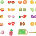 Set dřevěného ovoce je vyroben z ekologického materiálu a pokryt dětem bezpečnou barvou. Obsahuje dřevěnou desku a nůž pro krájení, což umožňuje dětem simulovat skutečné kuchyňské činnosti. Ovoce se skládá z polovin spojených suchým zipem, který poskytuje jemný odpor při krájení a vydává zvuk jako při krájení skutečného ovoce.