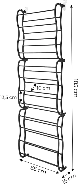 Robustní konstrukce kombinuje kovové trubky pro police a odolné plastové prvky na bocích. Tři vzájemně propojené segmenty tvoří dohromady 12 úrovní, na které pohodlně umístíte až 36 párů. Montáž je rychlá, bez nutnosti nářadí a vrtání – stejně snadno jej i přemístíte.