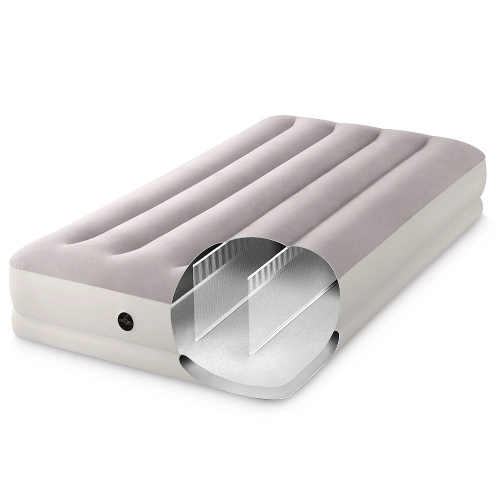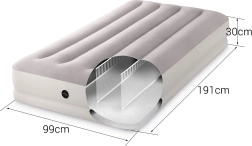 Nafukovací postel INTEX kombinuje odolný PVC materiál s měkkým flockovaným povrchem, který je příjemný na dotek a zlepšuje komfort spánku. Zvýšená konstrukce s podélnými komorami a vnitřními výztuhami zajišťuje stabilitu bez houpačkového efektu a spolehlivou oporu páteře.