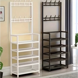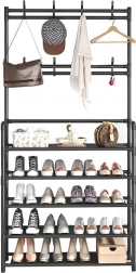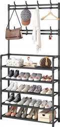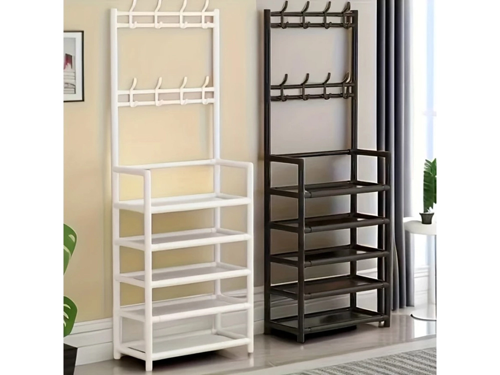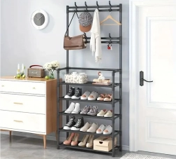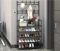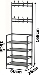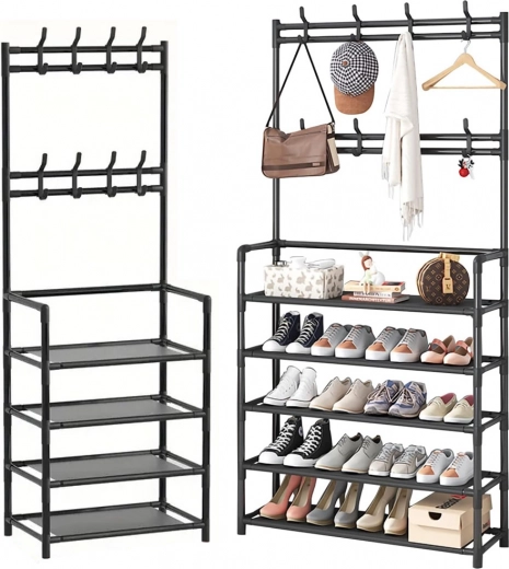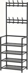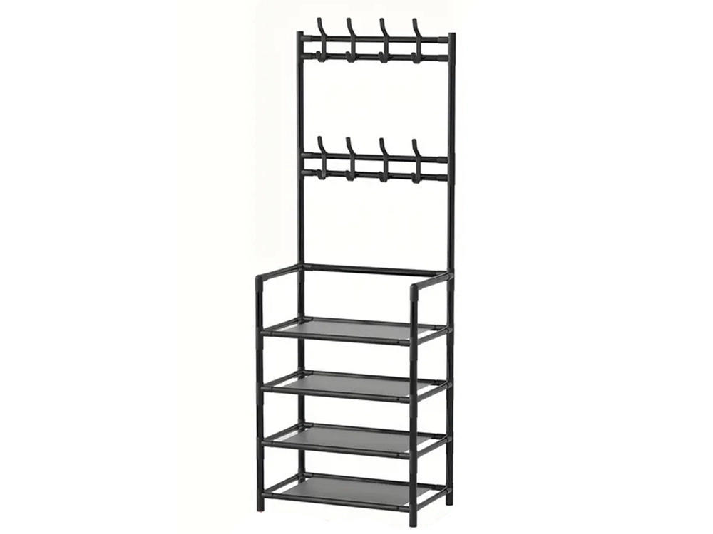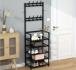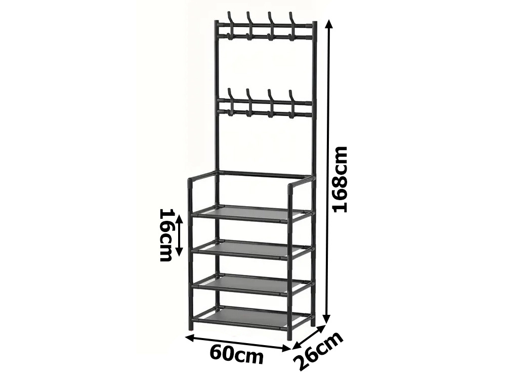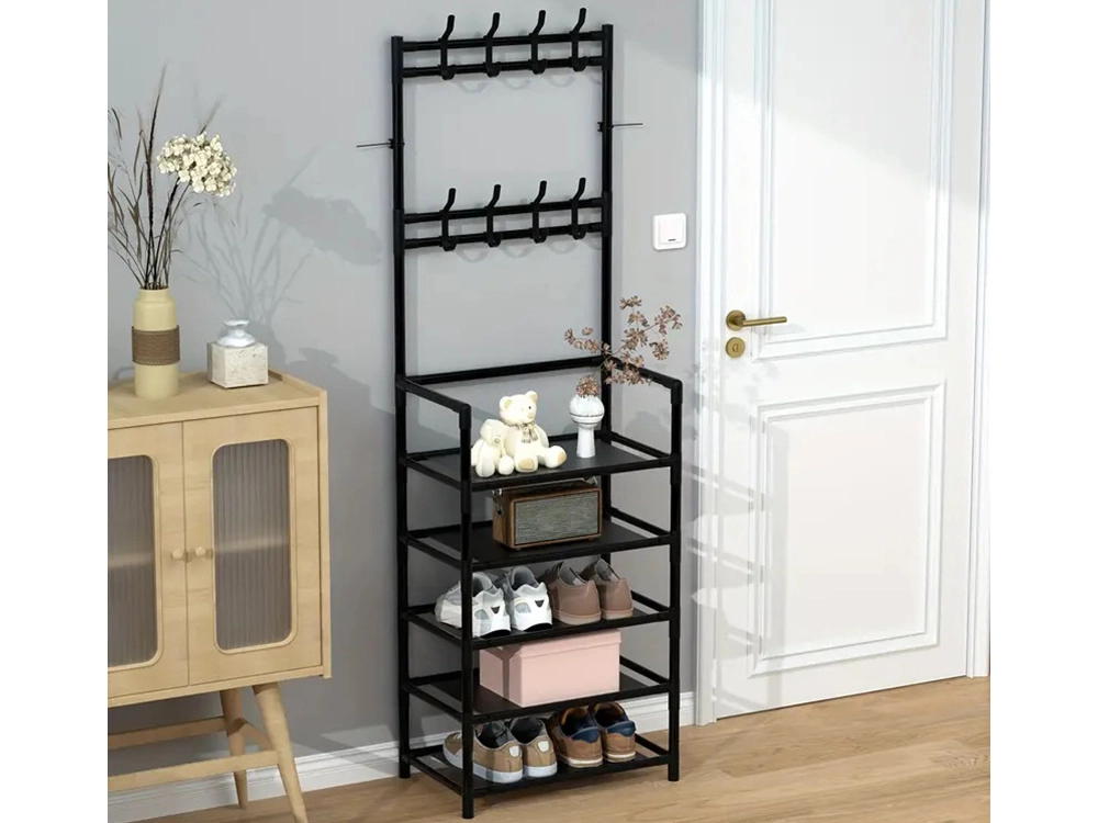 Tento elegantní předsíňový organizér šetří místo a udržuje vše po ruce. Pět otevřených polic pojme řadu párů bot a doplňků, zatímco dvě řady pevných háčků nabídnou prostor pro kabáty, tašky, šály či klíče. Minimalistické černé provedení se hodí do moderních interiérů.