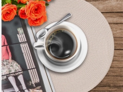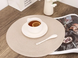 Kulatý tvar a pletená struktura dodají prostření styl, zatímco voděodolný materiál spolehlivě chrání povrch před skvrnami a teplotními otisky nádobí.