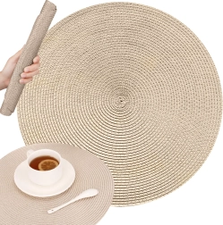 Dodejte stolování přírodní šarm a praktičnost. Toto kulaté prostírání s pleteným vzhledem je vyrobené z odolného plastu, takže spolehlivě chrání povrch stolu a zároveň působí elegantně. Béžový odstín se snadno kombinuje s různými barvami nádobí i dekorací – od klasiky po modernu.