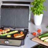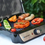 Elektrický gril Blaupunkt GRS701 je ideální volbou pro milovníky grilovaných pochoutek, kteří chtějí jednoduše připravit masa, sendviče a pochutiny na každé setkání. Díky tomuto grilu si můžete dopřát chutný zážitek bez ohledu na venkovní počasí. Moderní technologie grilu zahrnuje žebrované plotny s nelepivým povrchem, které neobsahují PFOA, což zajišťuje zdravější přípravu jídel. Funkce rozložení poklopu na 180 stupňů umožňuje využití celkové plochy pro grilování většího množství surovin naraz. Zdravý způsob přípravy: Elektrický gril umožňuje grilování s minimem tuku, čímž snižuje kalorickou hodnotu pokrmů. Přebytečný tuk se odvádí do speciální nádoby. Tímto způsobem je grilování zdravější ve srovnání s tradičními grily na dřevěné uhlí.