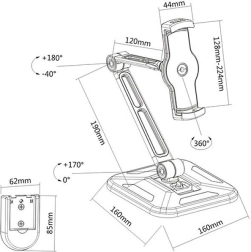 Univerzální ramenní držák pro tablety, který umožňuje pohodlné nastavení na pracovní stůl nebo montáž na zeď. Kompatibilní s většinou tabletů o velikosti 4,7'' až 12,9'' a nabízí snadnou regulaci orientace a sklonu.