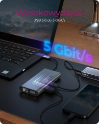 Port USB‑C s podporou Power Delivery 3.0 zajistí napájení notebooku až 100 W (bez přenosu dat), takže stačí jediný kabel. Nechybí čtečky SD a microSD pro rychlé zálohy z fotoaparátů a 3,5mm combo jack pro sluchátka či mikrofon. Odolné hliníkové tělo účinně odvádí teplo a působí elegantně.