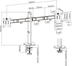 Univerzální kloubový držák pro dva monitory o velikosti 17–32" a hmotnosti až 9 kg na každý monitor. Montáž na okraj stolu nebo do průchodky, kompatibilita VESA 75x75 a 100x100. Nabízí plnou ergonomickou nastavitelnost – výšku, náklon i otočení – pro maximální pohodlí a úsporu místa na pracovním stole.