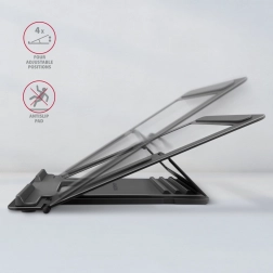 Stojan nabízí čtyři nastavitelné pozice pro ideální ergonomii, čímž snižuje únavu a bolesti při dlouhodobé práci. Kompaktní design umožňuje snadné skládání a přenášení v dodávaném obalu – perfektní pro cestování.