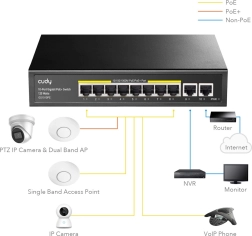 Díky 8 PoE+ portům a 2 uplink portům může zařízení podporovat vysokorychlostní připojení 10/100/1000 Mb/s a tím zaručuje efektivní přenos dat v celé síti.
