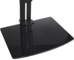 Integrovaná skleněná police pojme Blu‑ray přehrávač, set‑top box, herní konzoli či tablet a pomáhá udržet kabeláž i příslušenství přehledně na jednom místě.