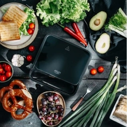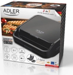 Adler Europe sendvičovač 2v1 je výjimečným řešením pro rychlé a jednoduché přípravy jídel. Díky vyměnitelným deskám se snadno přepínáte mezi přípravou toastových sendvičů a grilováním oblíbených pokrmů. Nepřilnavý povrch a izolovaná rukojeť zajišťují bezpečné a pohodlné vaření. Kompaktní design usnadňuje skladování.