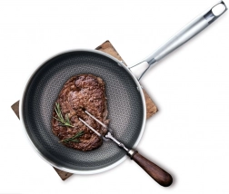 Ocelová „plástvová“ textura chrání povrch před poškrábáním i při použití kovových nástrojů a umožňuje snadné uvolnění pokrmů.