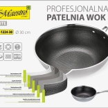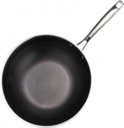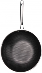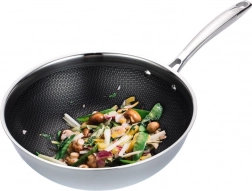 Robustní wok MAESTRO o průměru 30 cm s třívrstvým tělem z nerezové oceli a hliníkového jádra zajišťuje rychlé a rovnoměrné rozložení tepla, odolnost proti poškrábání a nepřilnavý povrch s voštinovou strukturou. Vhodný pro všechny typy sporáků včetně indukce, s pohodlnou nerezovou rukojetí, která se nepřehřívá, a možností mytí v myčce.