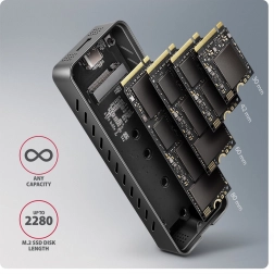 Vytvořte si bleskurychlý a kompaktní externí disk. Externí box AXAGON armored box s rozhraním USB 3.2 Gen 2x2 (20 Gb/s) je určen pro M.2 NVMe SSD (M‑key / B+M‑key) bez omezení kapacity. Hliníkové šasi, teplovodivá podložka a boční větrací otvory zajišťují účinné chlazení a minimalizují riziko thermal throttlingu. Silikonový ochranný návlek zlepšuje úchop, tlumí nárazy a brání klouzání po povrchu.