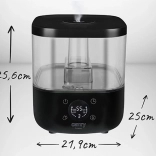 Intuitivní LED displej s dotykovými tlačítky usnadní nastavení požadované úrovně vlhkosti i časovače. Praktické plnění shora šetří čas při doplňování vody a noční režim zajistí nerušený spánek díky velmi tichému chodu. Bezpečnost hlídá čidlo nedostatku vody, které zařízení automaticky vypne.