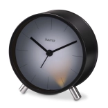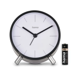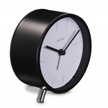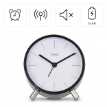 Stylový stolní budík s analogovým ciferníkem a bílou přehlednou stupnicí v elegantním černém provedení. Nabízí klasický design s kovovými nožičkami, jednoduché nastavení jednoho času buzení, funkci dřímání a podsvícení na stisk tlačítka, které se automaticky vypne.