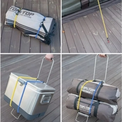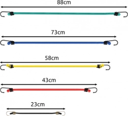 Tyto univerzální gumy na zavazadla se hodí nejen pro automobily, ale rovněž na kempování či survival aktivity. Zachovávají pružnost i po opakovaném roztažení a jsou jednoduché na použití, neboť každý popruh je opatřen pevným kovovým hákem pro rychlé uchycení.