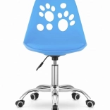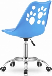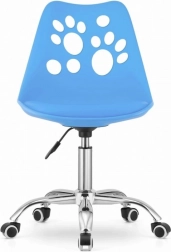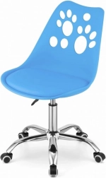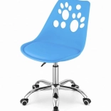 Otočná modrá plastová židle s kovovým podstavcem a dekorativními výřezy ve tvaru tlapek, ideální pro domácí kanceláře či dětské pokoje.