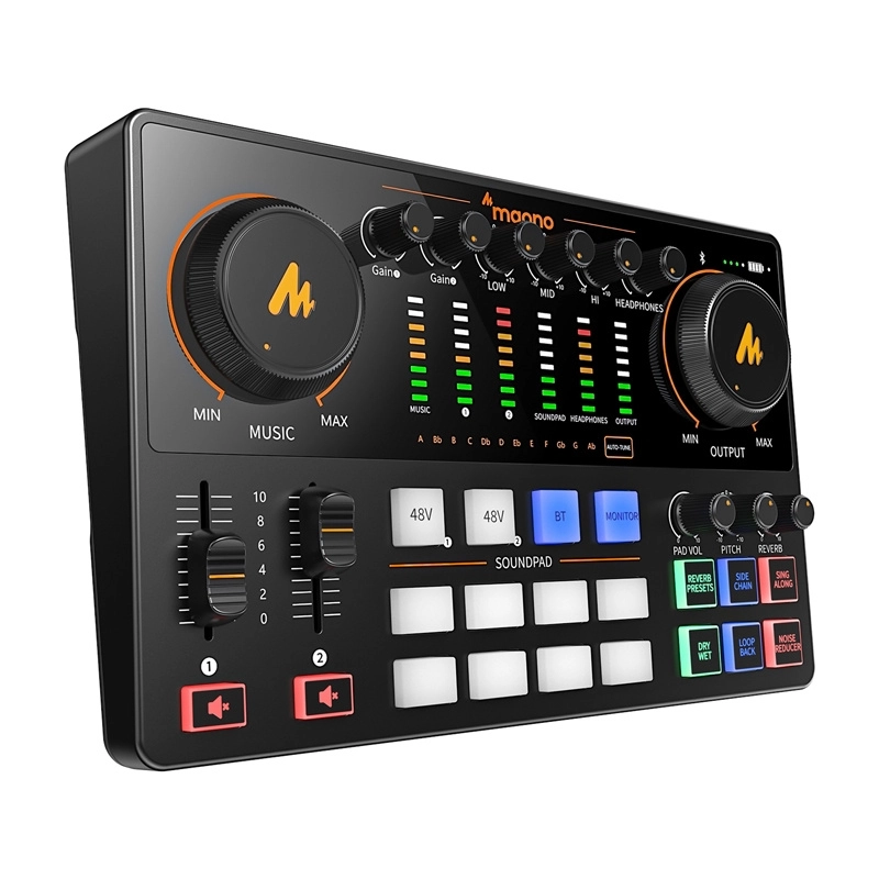 Maono E2 Gen2 poskytuje profesionální mikrofonní obvody s zesílením až 60 dB, což je dostatečné pro většinu dynamických a kondenzátorových mikrofonů. Každý kanál má vlastní ovládání hlasitosti a napájení, čímž zajišťuje větší kontrolu při nahrávání různých obsahů.
