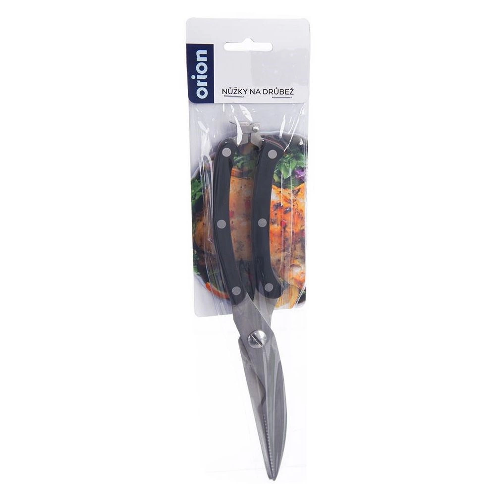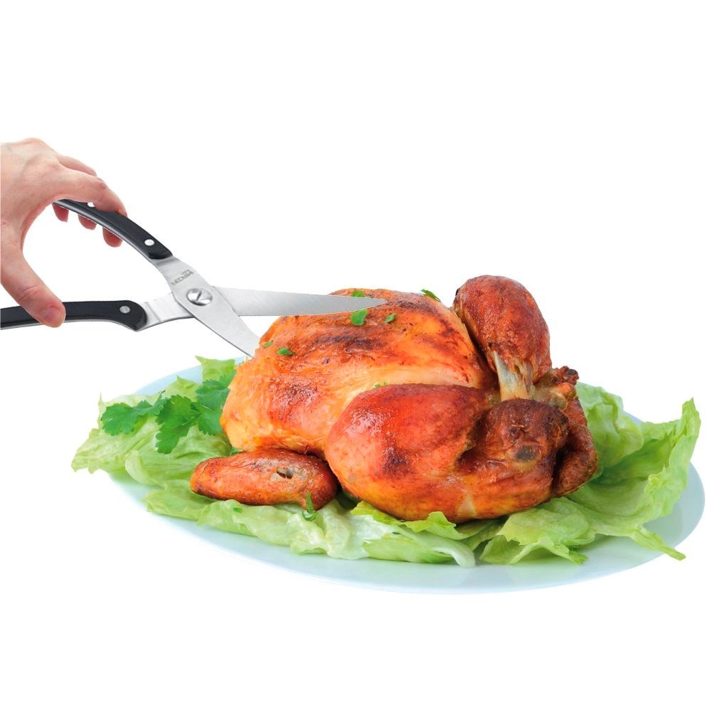 Odolné kuchyňské nůžky na drůbež z nerezové oceli o délce 24,5 cm usnadní krájení syrového i pečeného masa. Mají ergonomické rukojeti, ostré nerezové čepele, bezpečnostní zámek pro snadné a bezpečné uložení a pevnou konstrukci pro dlouhou životnost.