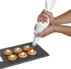 Cukrářský sáček usnadní plnění a zdobení krémů, polev a náplní. Vnitřní gumová vrstva brání prosakování a umožňuje práci s hustými i tekutějšími hmotami. Díky pružnému materiálu se zdobí přesně a pohodlně, ať už jde o dorty, cupcaky, sušenky nebo slané jednohubky.