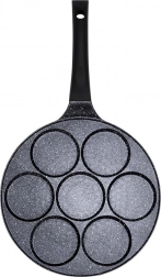 Praktická granitová pánev se 7 kulatými formami o průměru 8 cm pro vejce, lívance a mini pancakes. Hliníkové tělo s nepřilnavou granitovou povrchovou úpravou umožňuje vařit s minimem tuku, rovnoměrně rozvádí teplo a šetří energii. Ergonomická rukojeť Soft Touch je příjemná do ruky a bezpečná. Vhodná na všechny typy sporáků včetně indukce a do myčky.