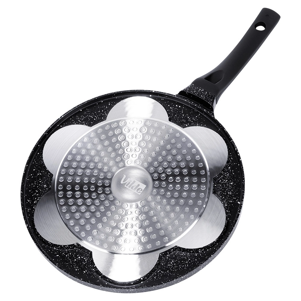 Vícevrstvé dno efektivně vede teplo po celé ploše pánve, zkracuje dobu přípravy a zajišťuje stejnoměrné propečení.