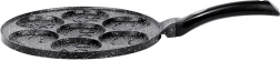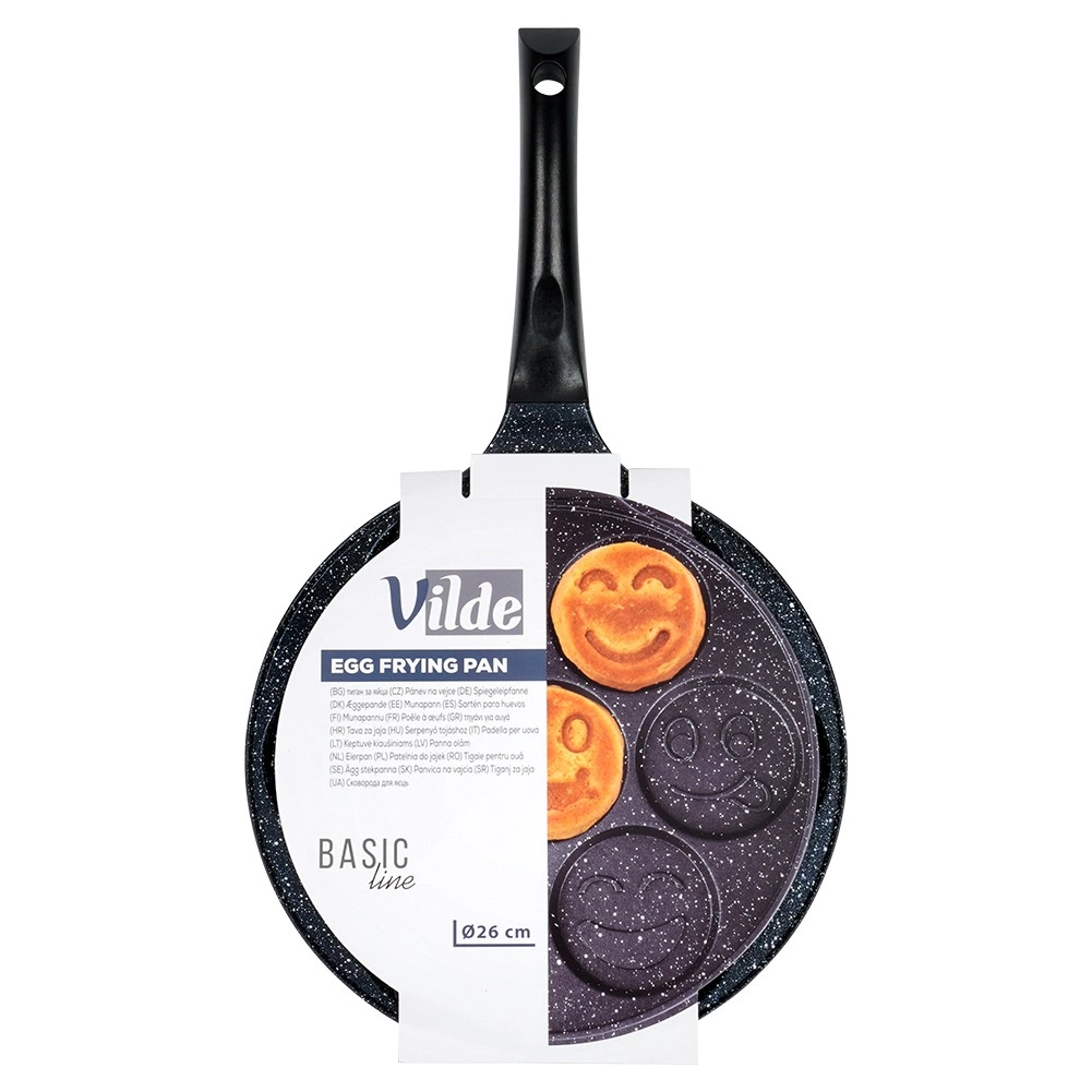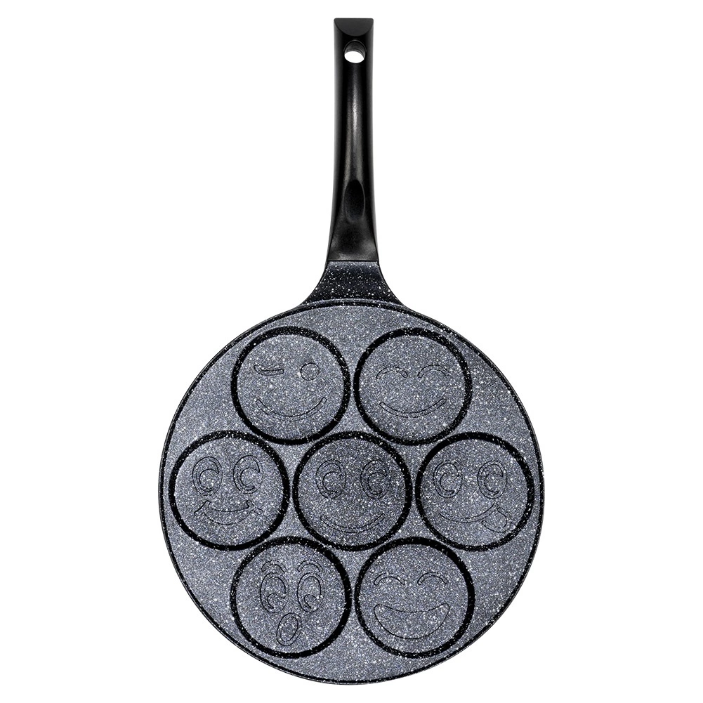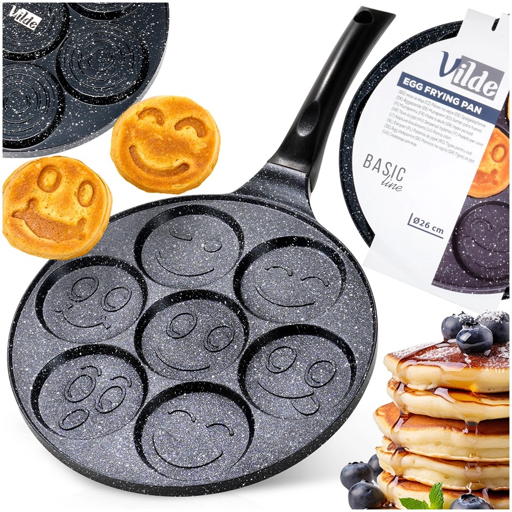 Zábavné mini lívance a dokonale kulatá vejce snadno a rychle – tato granitová pánev BASIC LINE o průměru 26 cm nabízí 7 samostatných formiček (cca 8 cm) s úsměvými reliéfy. Díky nepřilnavému granitovému povrchu vaříte s minimem tuku, rovnoměrně se zahřívá a má pohodlnou rukojeť s očkem na zavěšení. Vhodná pro plynové, elektrické i keramické sporáky a lze mýt v myčce.