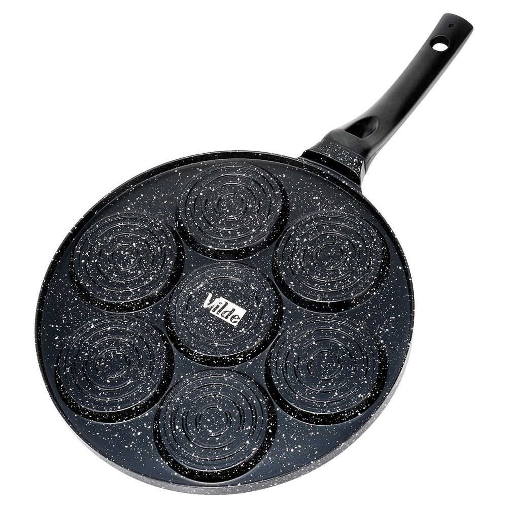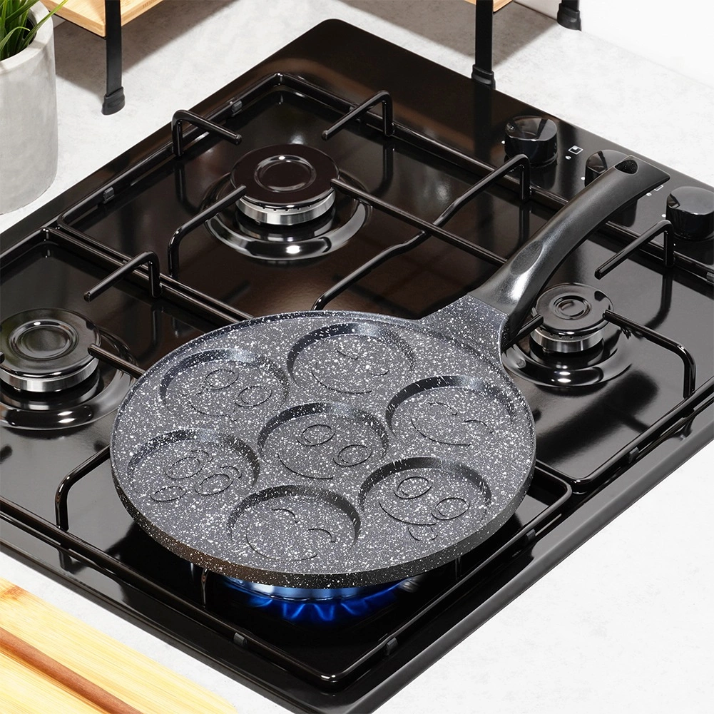 Vytvořte si perfektní snídaně pro celou rodinu: 7 kulatých otvorů s veselými „smiley“ motivy vykouzlí stejnoměrné porce lívanců, mini palačinek nebo sázených vajec. Nepřilnavá granitová vrstva zajistí snadné obracení i servírování a minimalizuje potřebu oleje.