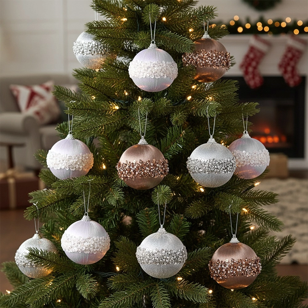 Elegantní sada vánočních koulí o průměru 8 cm v odstínech bílá, stříbrná a šampaňská. Každá koule je lehké a netříštivé provedení ze styroporu, potažené saténovou tkaninou a zdobené širokým pruhem třpytivých korálků a flitrů pro luxusní vzhled. Ideální na vánoční stromek, věnce i sváteční aranžmá a skvělý tip na dárek.