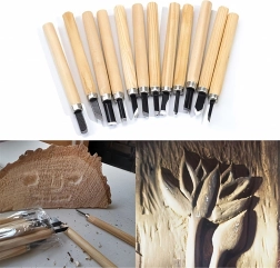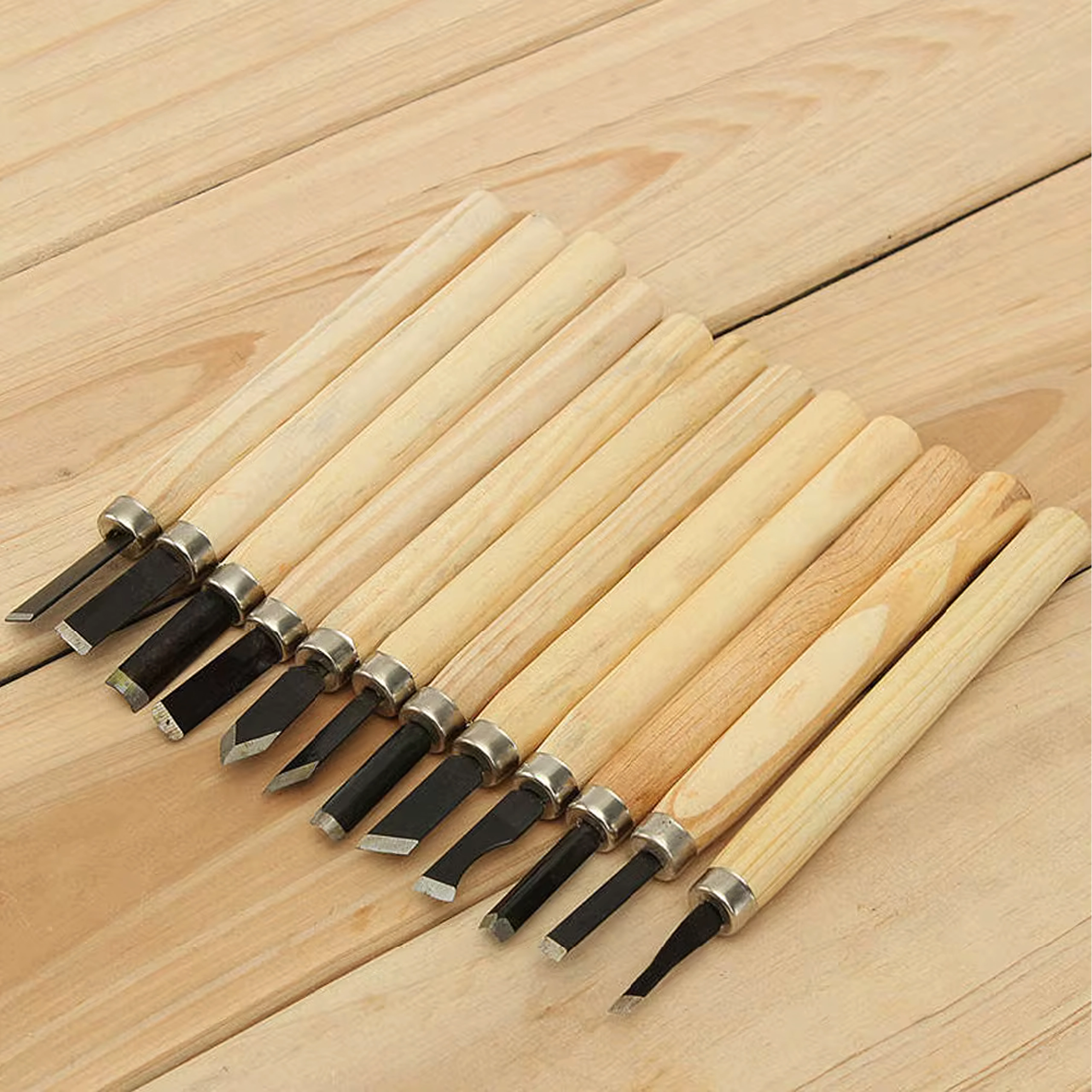 Sada zahrnuje ploché, V a U dláta pro detaily, prohlubně i rovné odebírání materiálu – vše, co potřebujete pro řezbářské projekty.