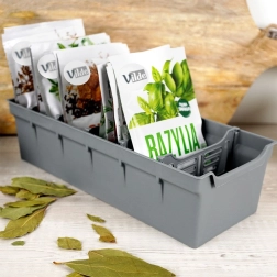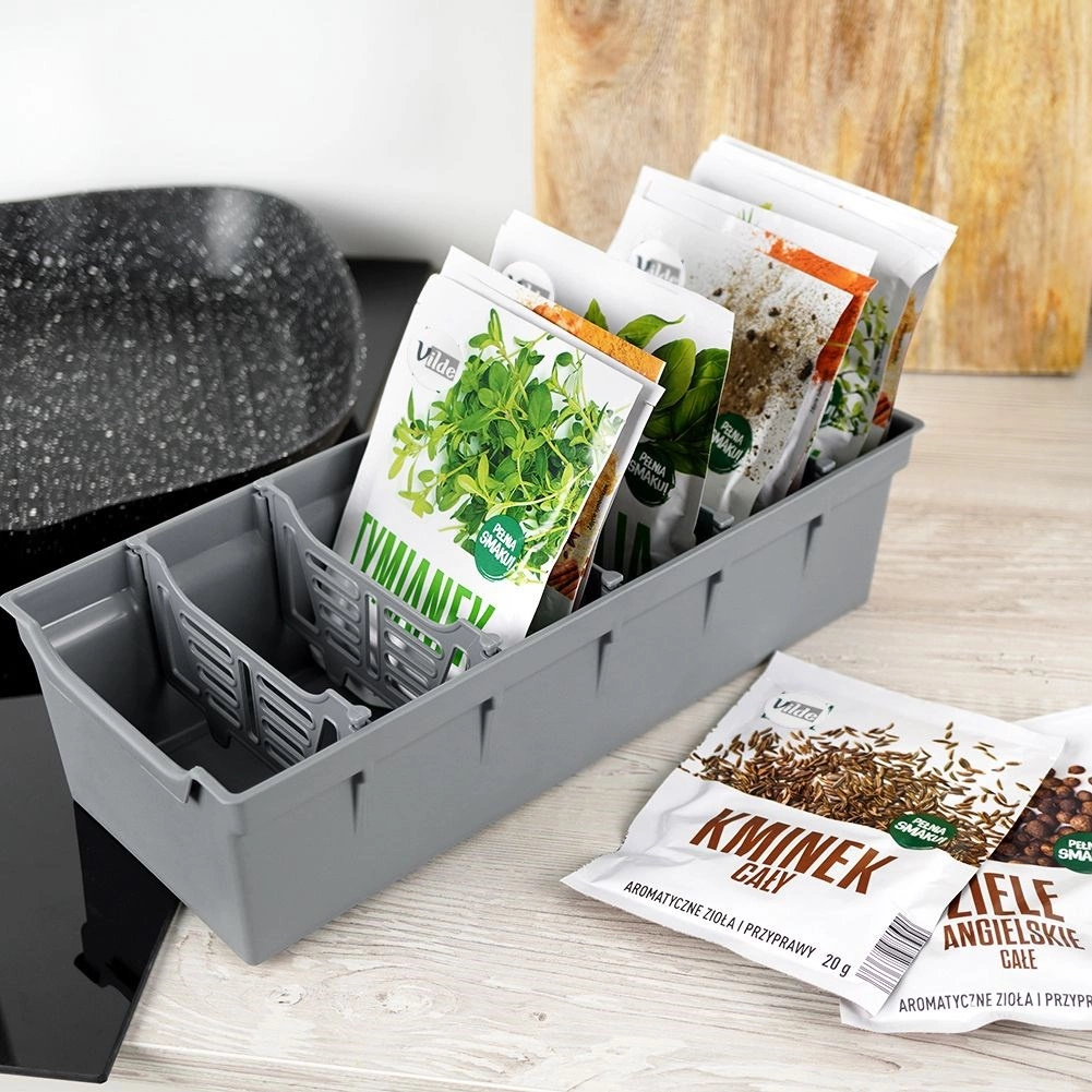 Organizer je vyroben z kvalitního, odolného plastu v elegantní šedé barvě. Uvnitř najdete pět vyjímatelných přepážek, které rozdělují prostor na šest částí – snadno si tak vytvoříte oddělení pro různé druhy koření a rychle najdete přesně to, co potřebujete. Skvělý nejen pro zavřené, ale i načaté sáčky.