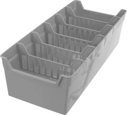 Kvalitní šedý plast je pevný, ale lehký. Otevřená konstrukce přepážek zajišťuje přehlednost a dobré proudění vzduchu.
