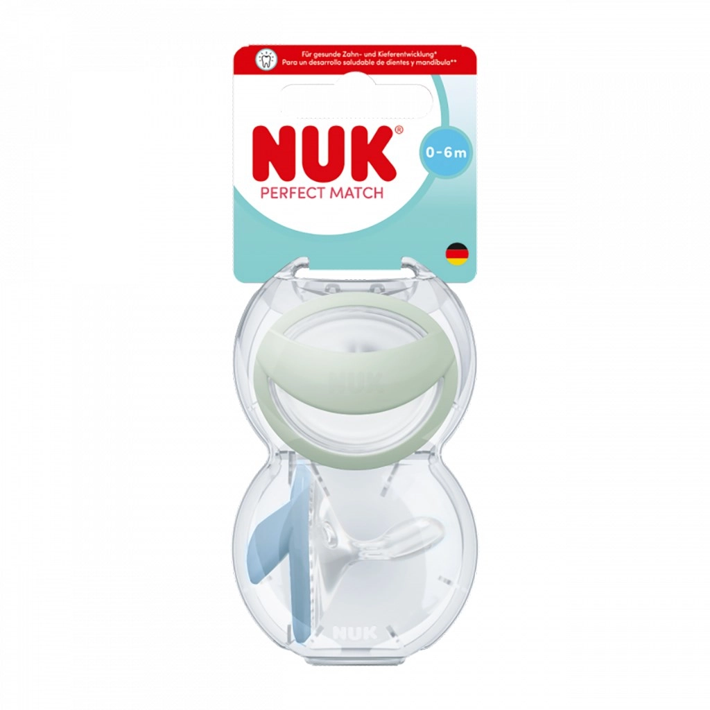 Uklidněte své miminko s dudlíkem NUK Perfect Match pro věk 0–6 měsíců. Ortodontický tvar podporuje zdravý vývoj zubů a čelistí, měkký silikon připomíná pokožku a podoba s maminčinou bradavkou usnadňuje přirozený přechod mezi kojením a dudlíkem. V balení jsou 2 kusy v barvách zelená a modrá, součástí je i cestovní pouzdro vhodné do mikrovlnky pro snadné hygienické čištění.