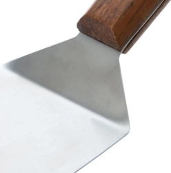 Tato robustní kuchyňská obracečka o délce 27 cm je spolehlivým pomocníkem pro každodenní vaření. Nerezová čepel s mírným pružením a broušenou (seříznutou) hranou skvěle klouže pod lívance, řízky, burgery či lasagne. Dřevěná rukojeť s nýty poskytuje pohodlné a bezpečné držení.