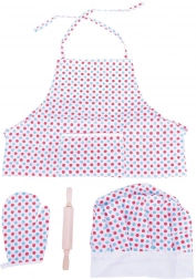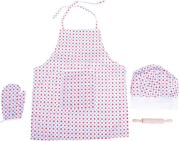 • Obsah balení: zástěra, kuchařská čepice, chňapka, dřevěný váleček, kovová vykrajovátka