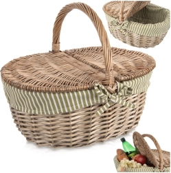 Elegantní proutěný piknikový koš s oboustranně otevíratelným víkem a pevným držadlem je ideální na výlety i do parku. Má vyjímatelnou látkovou vložku v zeleno-bílém proužku, kterou lze prát, a nabízí pevnou ruční výrobu z přírodní vrby, dostatek prostoru pro občerstvení a univerzální využití – od pikniku přes nákupy až po sběr hub.