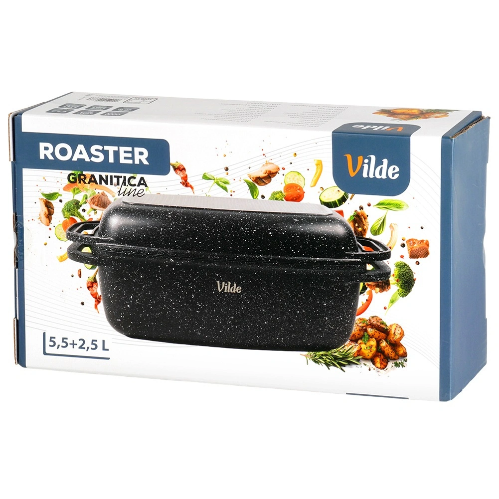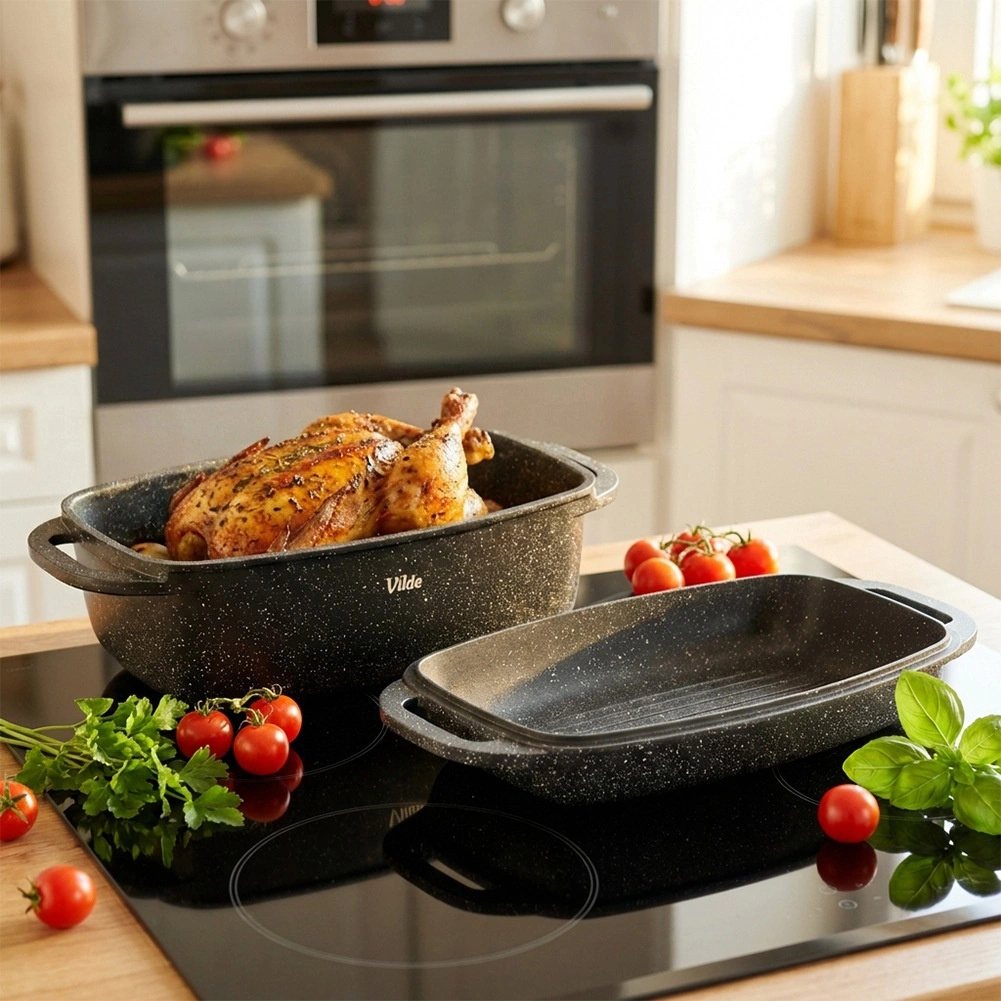 Praktický granitový pekáč s víkem 2v1 pro pečení, dušení a zapékání. Víko slouží také jako samostatná pánev/gril. Hliníkový odlitek s nepřilnavým granitovým povrchem, indukční dno a bezpečné madla pro snadnou manipulaci. Objem 5,5 l + 2,5 l, rozměry 40 × 22,5 cm, odolnost do 250 °C, vhodné do trouby i na všechny typy sporáků a do myčky. VILDE Granitica.