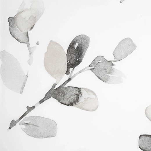 - Moderní botanický vzor – decentní šedé listy na bílé pro čistý vzhled.