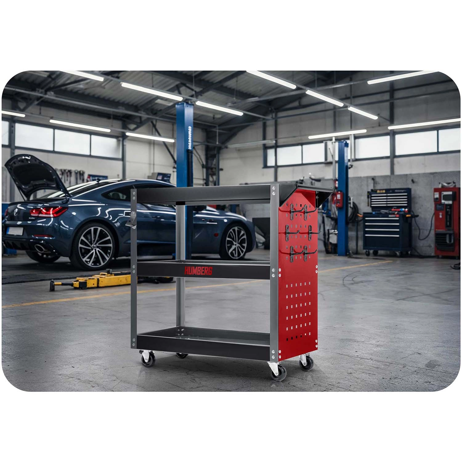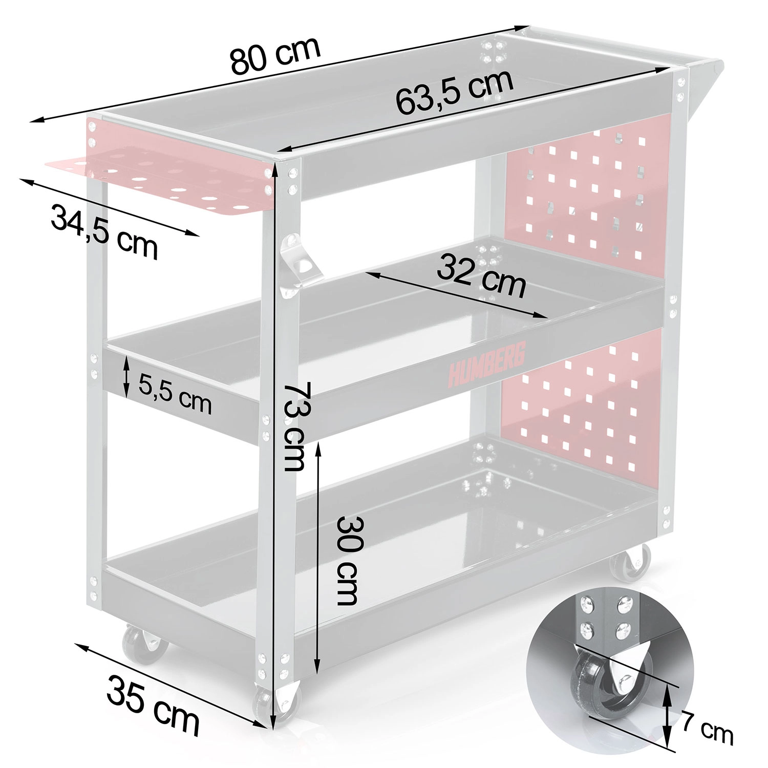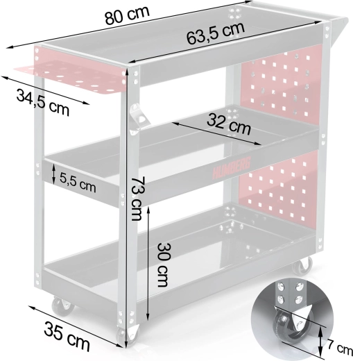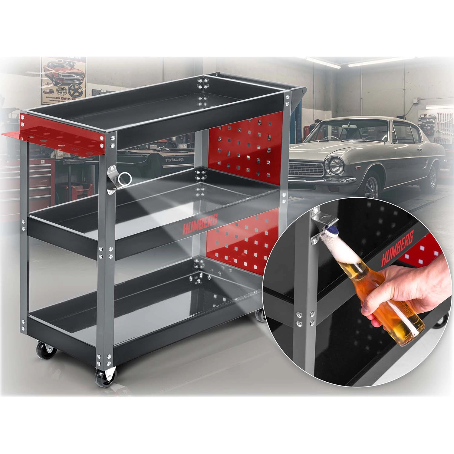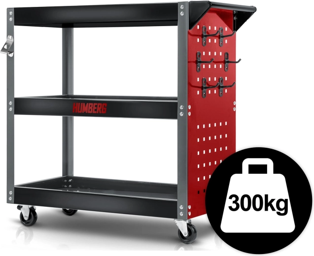 Vozík HUMBERG je navržen pro náročné dílenské prostředí. Kombinuje nerezovou ocel a hliník pro vysokou odolnost a dlouhou životnost. Tři hluboké police poskytují dostatek prostoru pro nářadí, díly i příslušenství, zatímco perforované boční panely s háčky udrží často používané nástroje vždy po ruce.