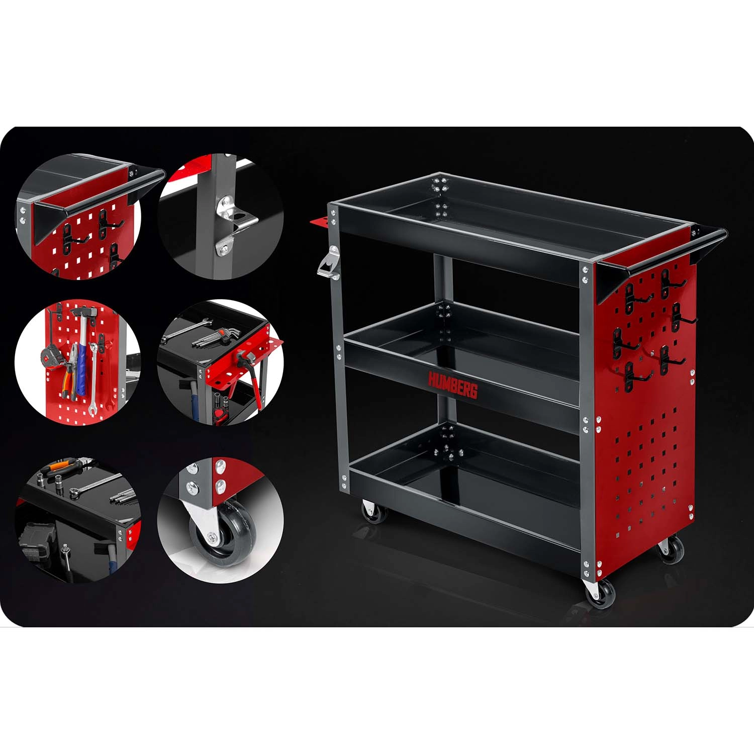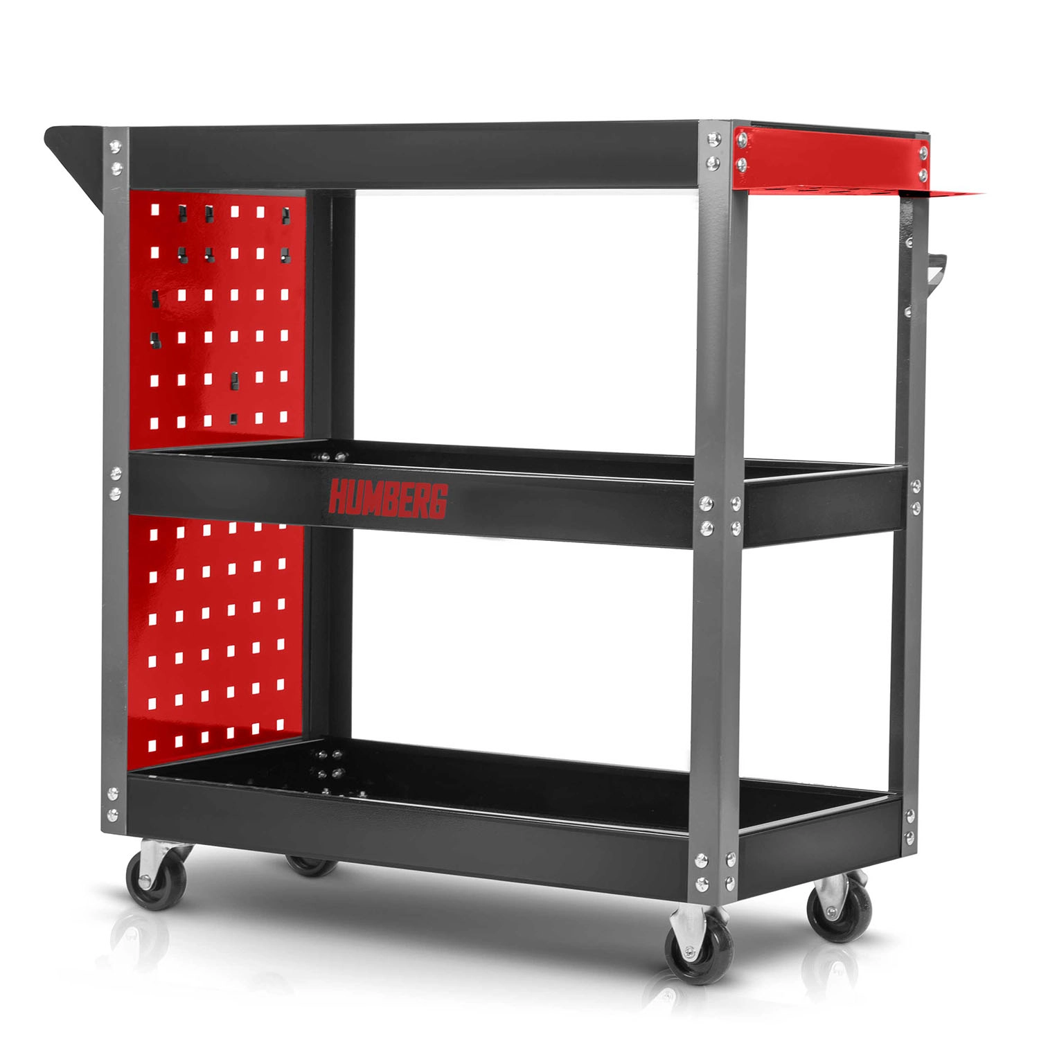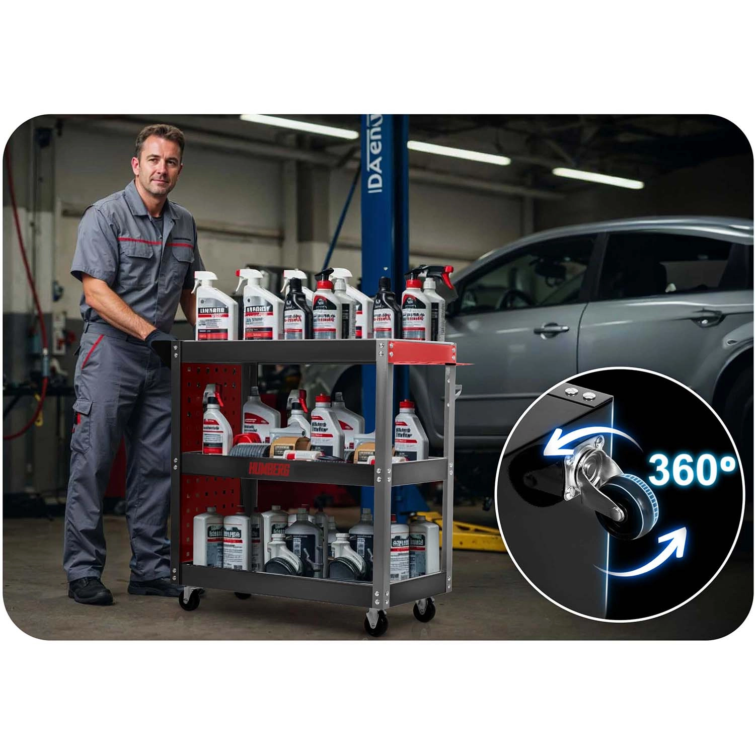 Vozík HUMBERG je navržen pro náročné dílenské prostředí. Kombinuje nerezovou ocel a hliník pro vysokou odolnost a dlouhou životnost. Tři hluboké police poskytují dostatek prostoru pro nářadí, díly i příslušenství, zatímco perforované boční panely s háčky udrží často používané nástroje vždy po ruce.