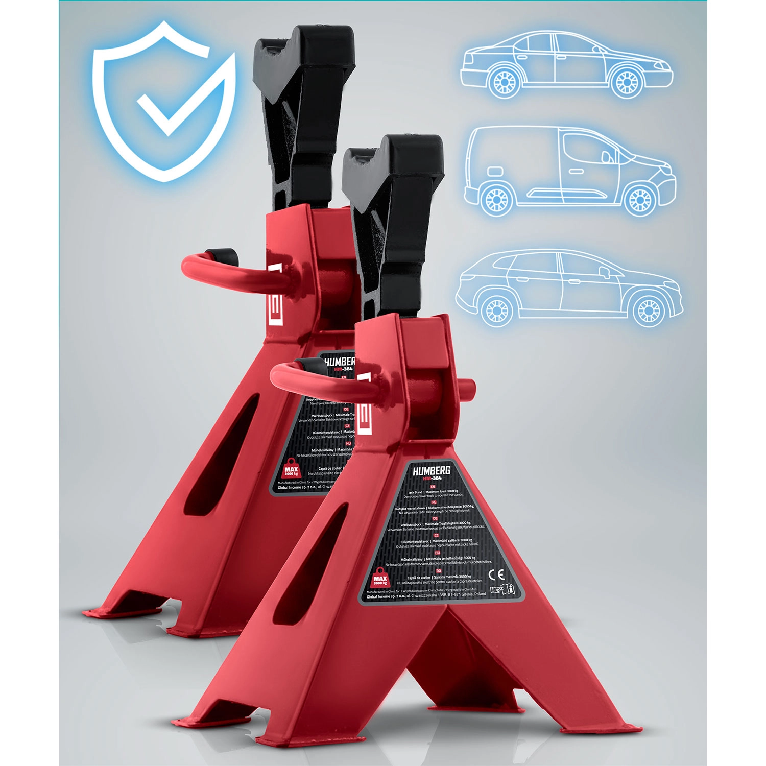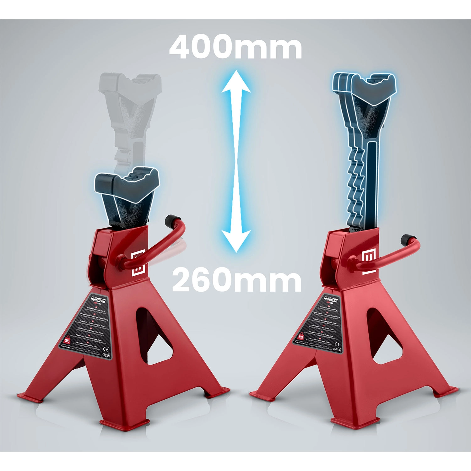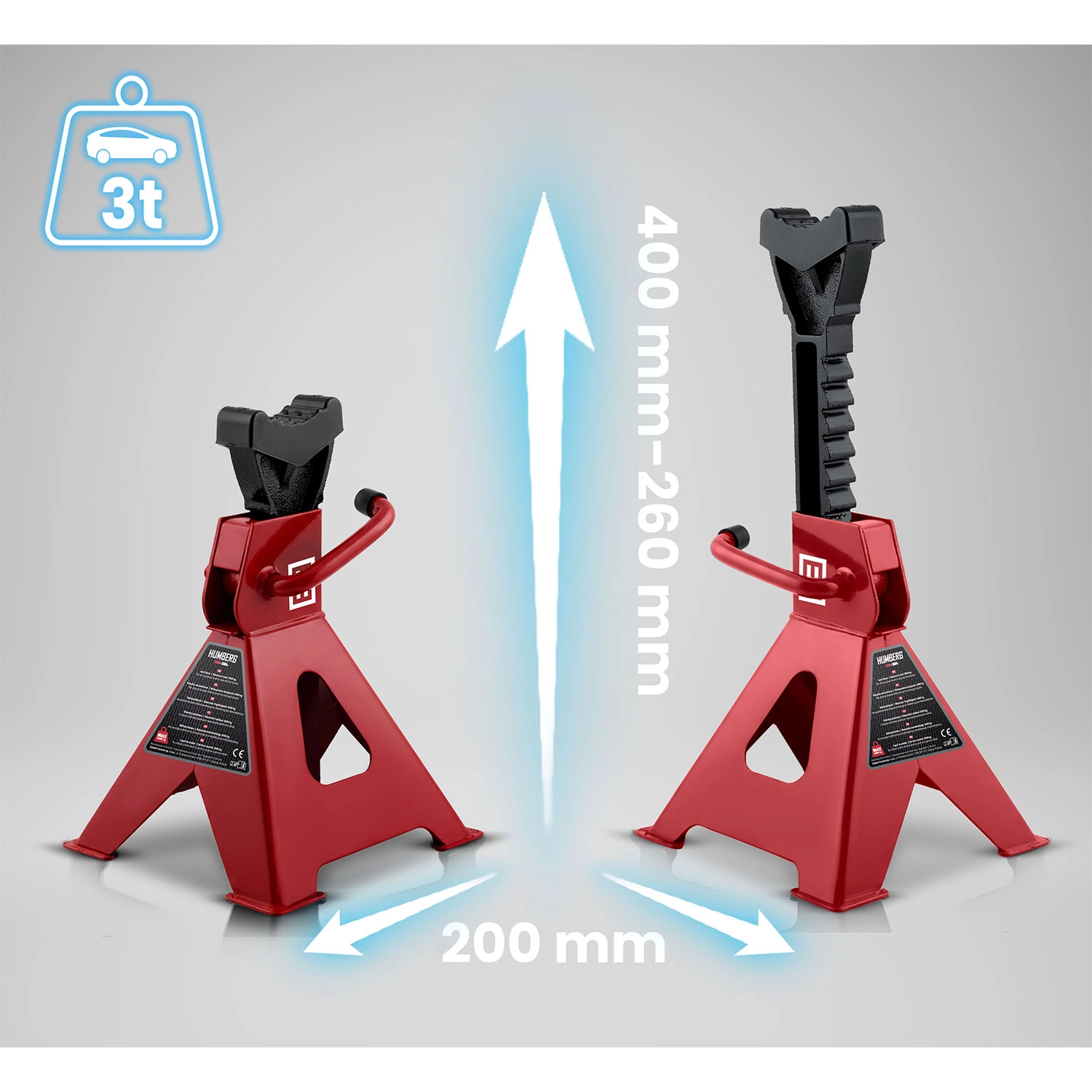 Robustní sada dvou automobilových podpěr s nosností až 3 tuny pro bezpečné zajištění vozidla při údržbě. Díky ráčnovému mechanismu snadno nastavíte výšku v rozsahu 260–400 mm. Ochranné gumové nástavce chrání podvozek před poškozením a stabilní ocelová konstrukce s širokou základnou zajišťuje jistotu i při maximálním zatížení.