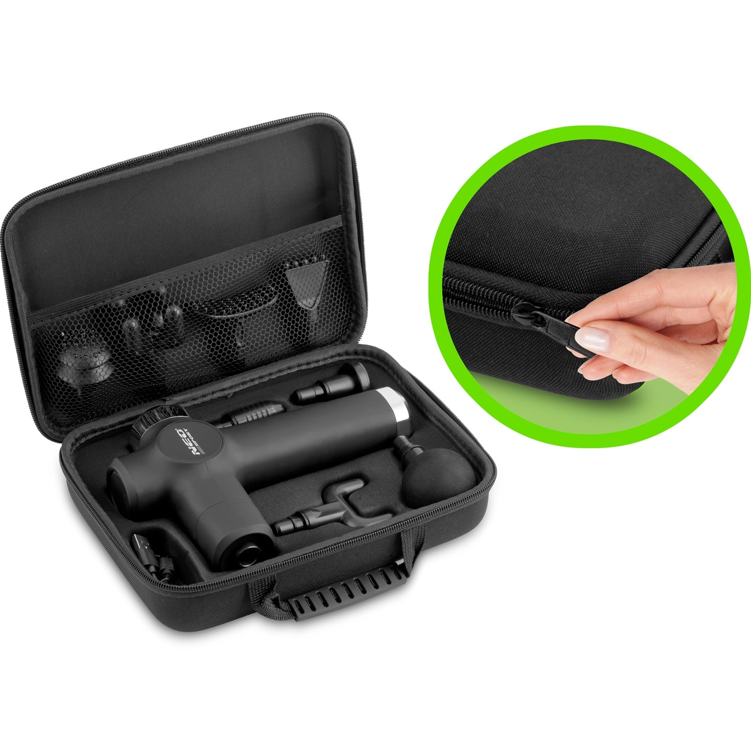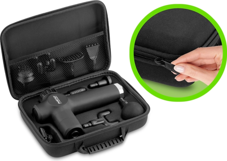 Díky 8 nástavcům snadno zacílíte velké svalové skupiny i hluboké trigger pointy. Vyberte si z 7 úrovní intenzity až do cca 3200 ot/min a přizpůsobte masáž rozcvičení, regeneraci i uvolnění po práci. Většinu hlavic (kromě koule) lze používat s masážním olejem – dbejte na to, aby se olej nedostal dovnitř přístroje.