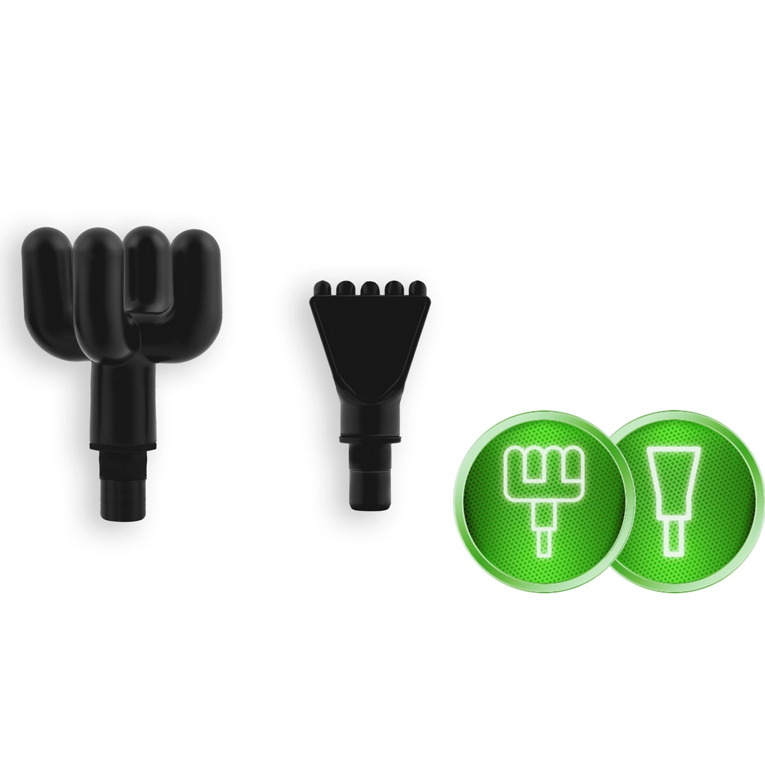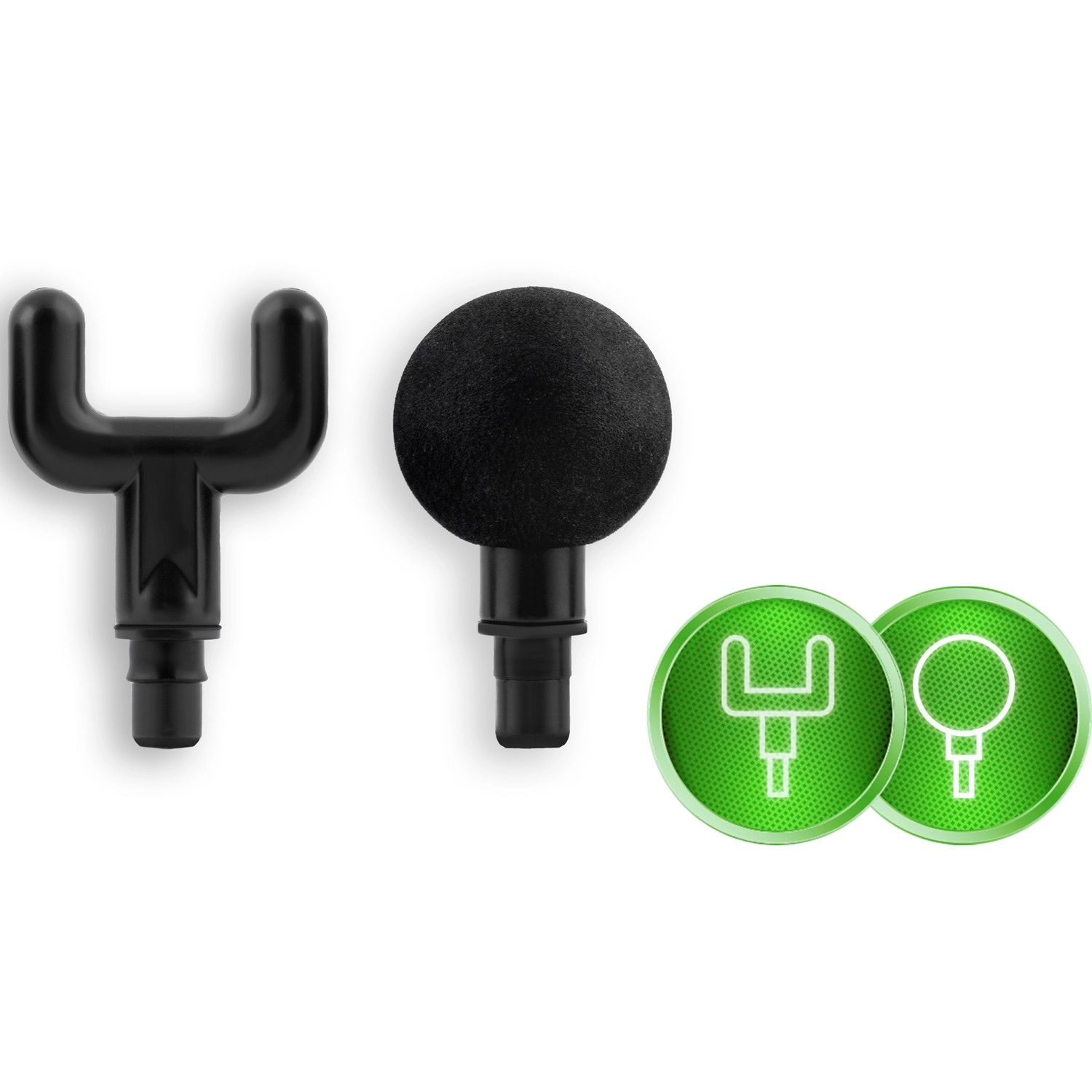 Kompletní sada nástavců pro různé partie: koule pro velké svaly, vidlice na oblast kolem páteře a šlach, plochá hlavice pro hutné tkáně, "pocisk" pro bodový trigger point, čtyřramenná a dvojité U, špachtle na šíji a ramena, banán a jemný „hříbek“ pro nejcitlivější místa.