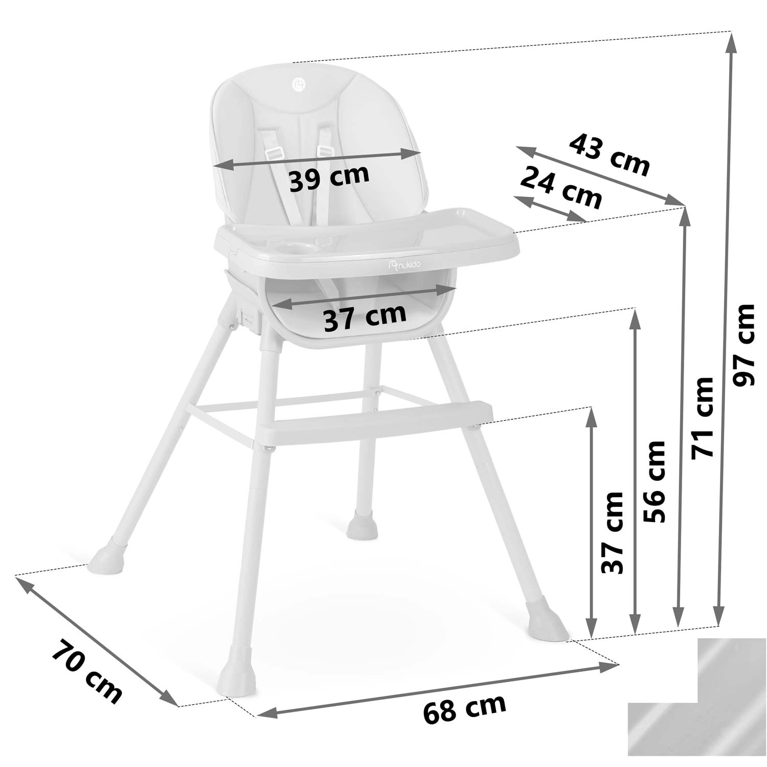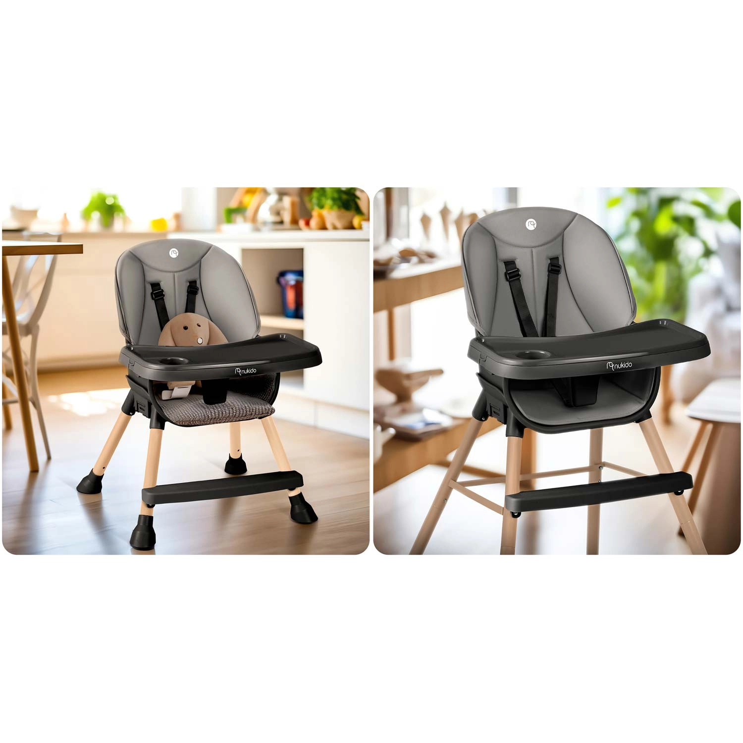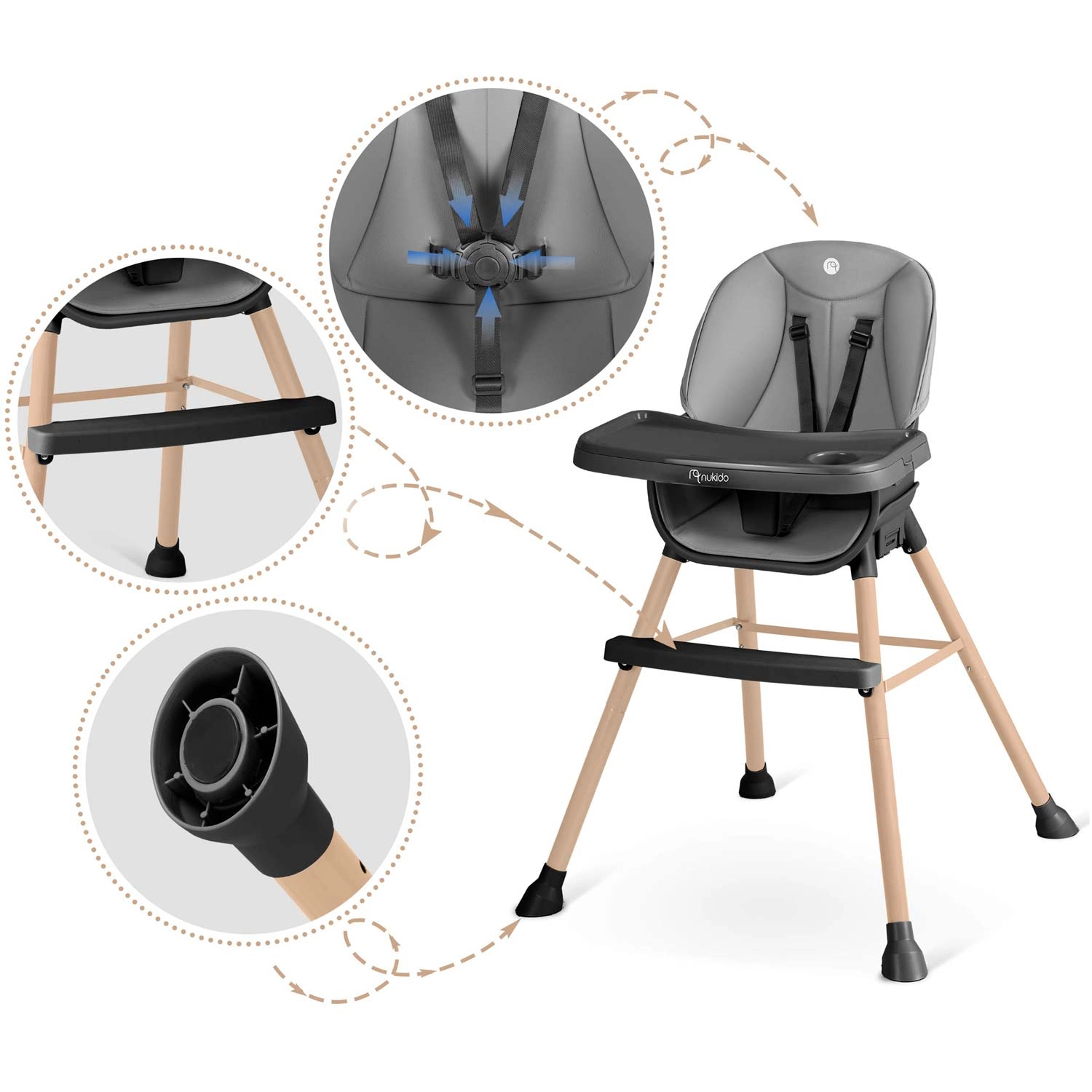 Praktická a stylová dětská jídelní židlička NUKIDO Tilo 3v1 roste s vaším dítětem – od prvních příkrmů po samostatné stolování i hraní. Nabízí polohovatelný a odnímatelný pultík s vyvýšenými okraji a vložkou, snadno omyvatelné materiály, 5bodový bezpečnostní pás a stabilní nohy s protiskluzovými koncovkami. Ideální pro krmení, kreslení i čtení – bezpečně, pohodlně a čistě během chvilky.