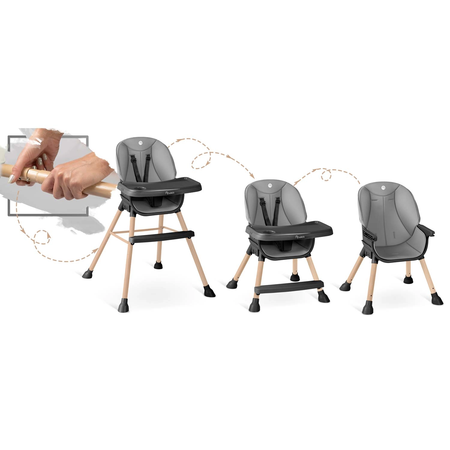Přepínejte mezi vysokou jídelní židlí, nízkým křesílkem s pultíkem a samostatnou židličkou pro hraní a čtení. Ideální od prvních příkrmů po batolecí období.