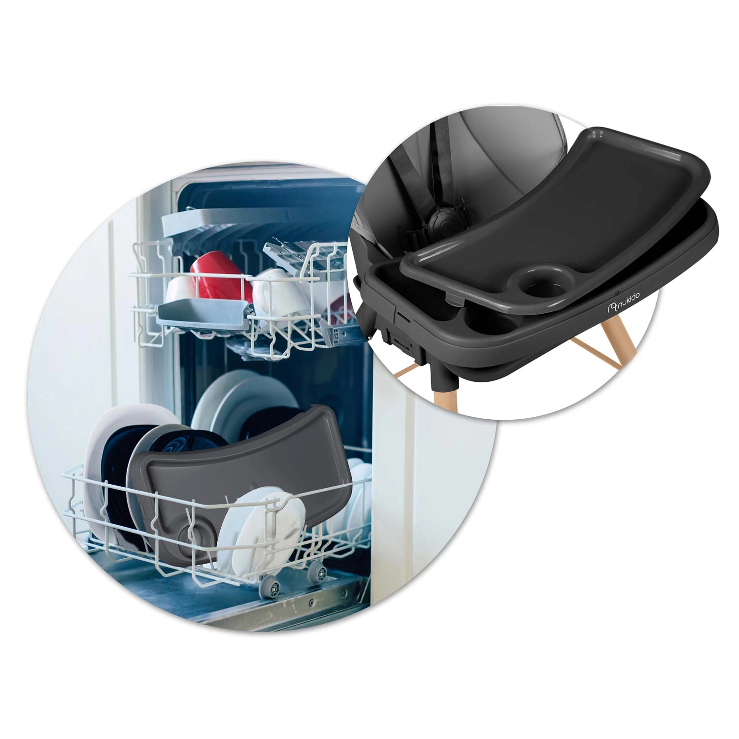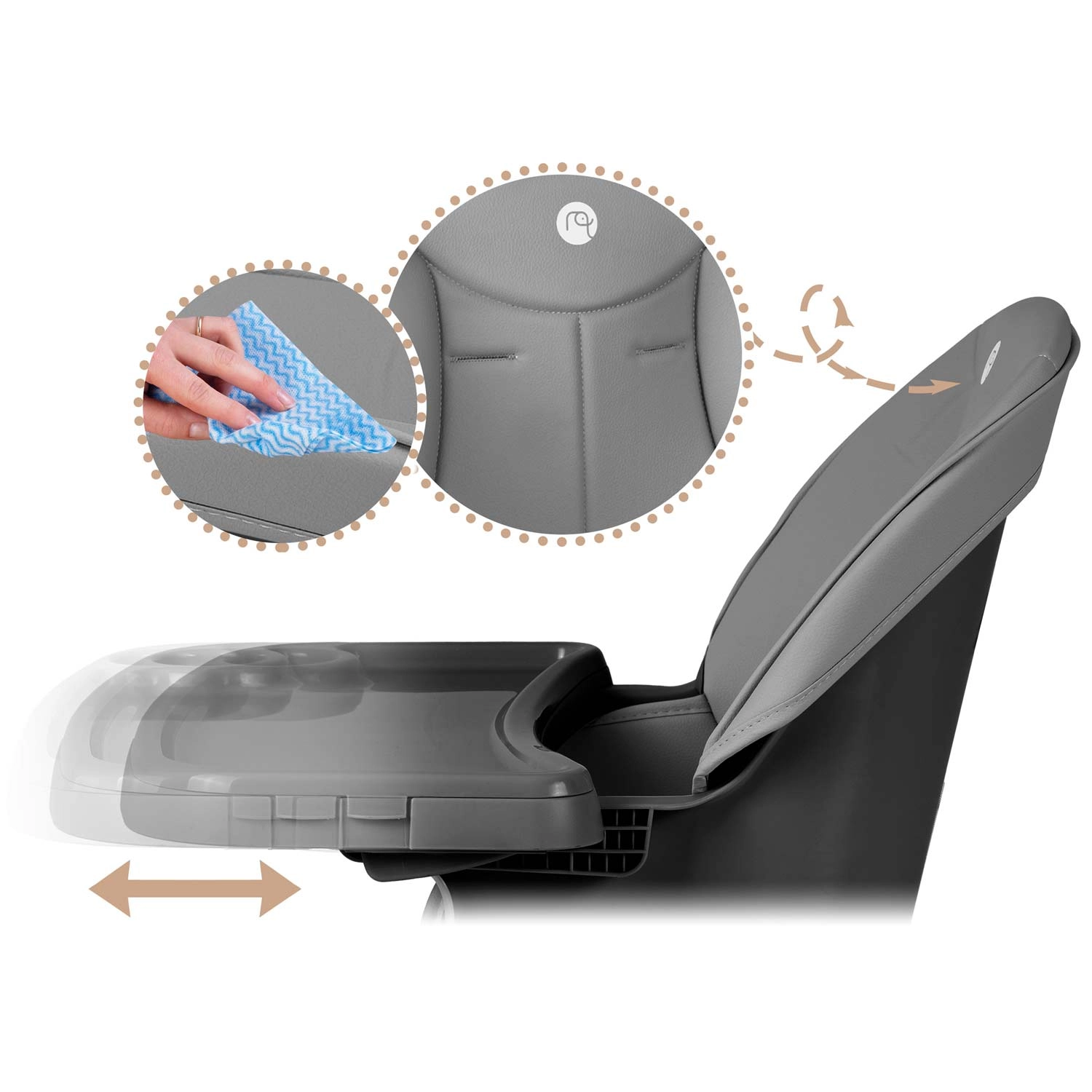 Hlavní pultík je posuvný a plně odnímatelný – s praktickou vložkou a zvýšenými okraji proti rozlití. Povrchy stačí jednoduše otřít vlhkým hadříkem, zatímco pult a vložku můžete mýt v myčce. Pro maximální bezpečí je tu 5bodový pás a pevná opěrka nohou. Židlička splňuje přísnou evropskou normu EN 14988.