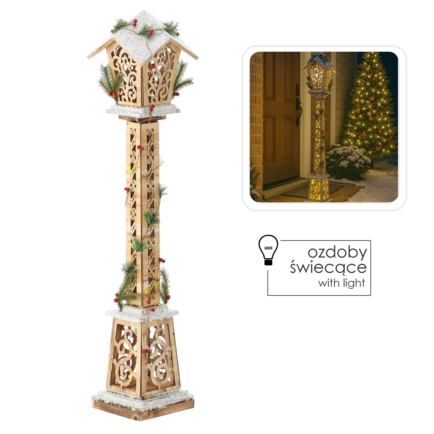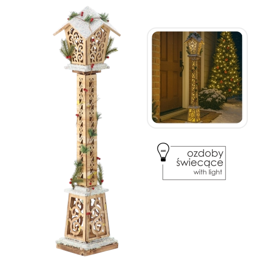 Stylová vánoční lucerna z přírodního dřeva s teplým LED osvětlením dodá vašemu domovu i vstupu kouzelnou sváteční atmosféru. Díky ornamentálním výřezům, zimním akcentům se sněhem, zelení a bobulemi a impozantní výšce 100 cm působí elegantně a útulně v interiéru i na kryté terase.