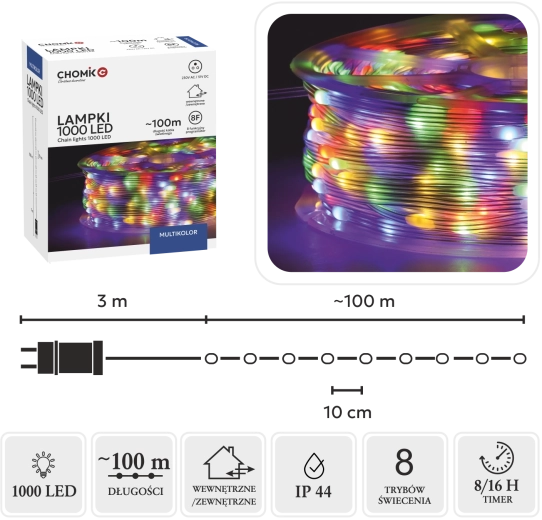 Praktický ovladač s 8 funkcemi má paměť posledního nastavení a časovač 8/16 h pro automatické zapínání a vypínání. Cívka v balení usnadní manipulaci, skladování i opakované použití. Díky krytí IP44 je řetěz vhodný do interiéru i chráněných venkovních prostor.